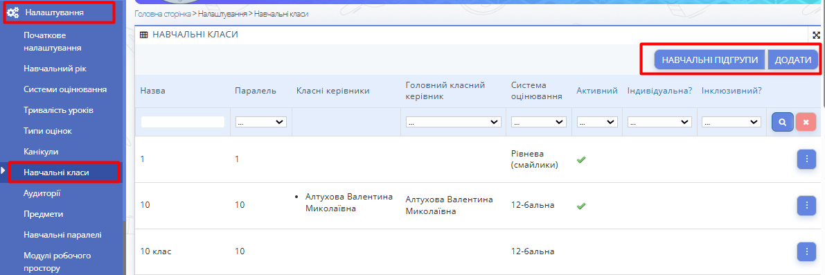 Рис. 1 — Сторінка "Навчальні класи" - Натисніть кнопку "Додати".