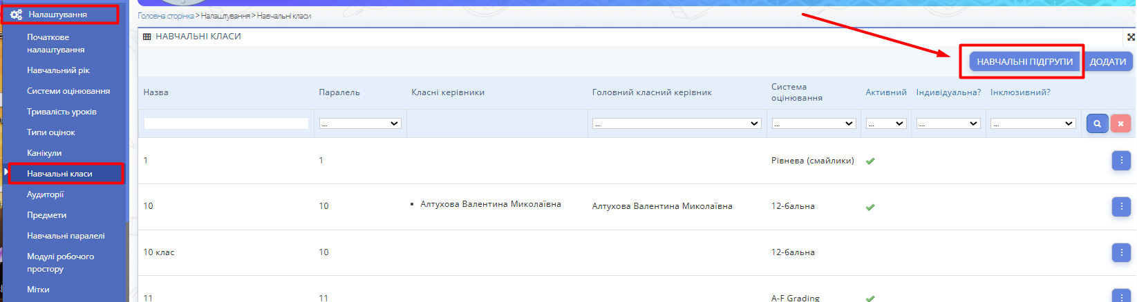 - У меню зліва виберіть розділ "Налаштування" -> "Навчальні класи".