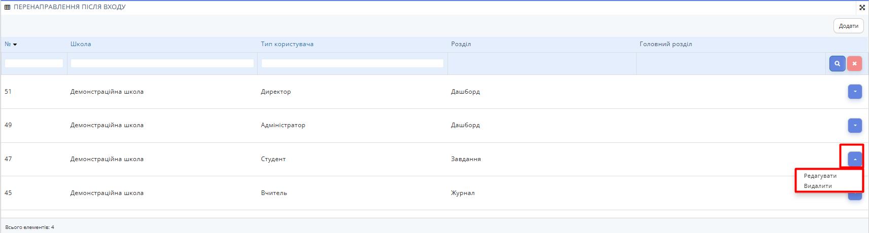 - Щоб відредагувати або видалити перенаправлення після входу для певних ролей на платформі, натисніть кнопку контекстного меню праворуч від потрібного Типу Користувача та виберіть відповідну опцію.
