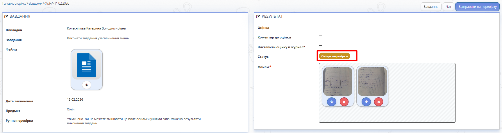 Після виконання тесту та завантаження файлів з домашнім завданням, натисніть кнопку "Відправити на перевірку". Статус завдання зміниться з "Виконується" на "Очікує перевірки".