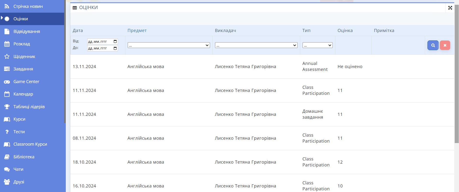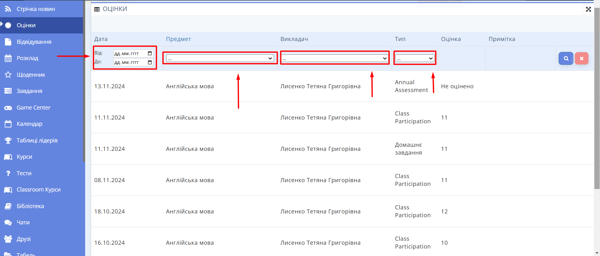 - Дату — період, за який хочете переглянути оцінки.