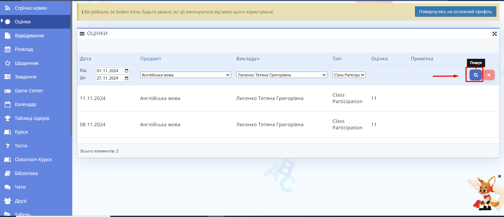 - Оберіть пункт меню "Оцінки".