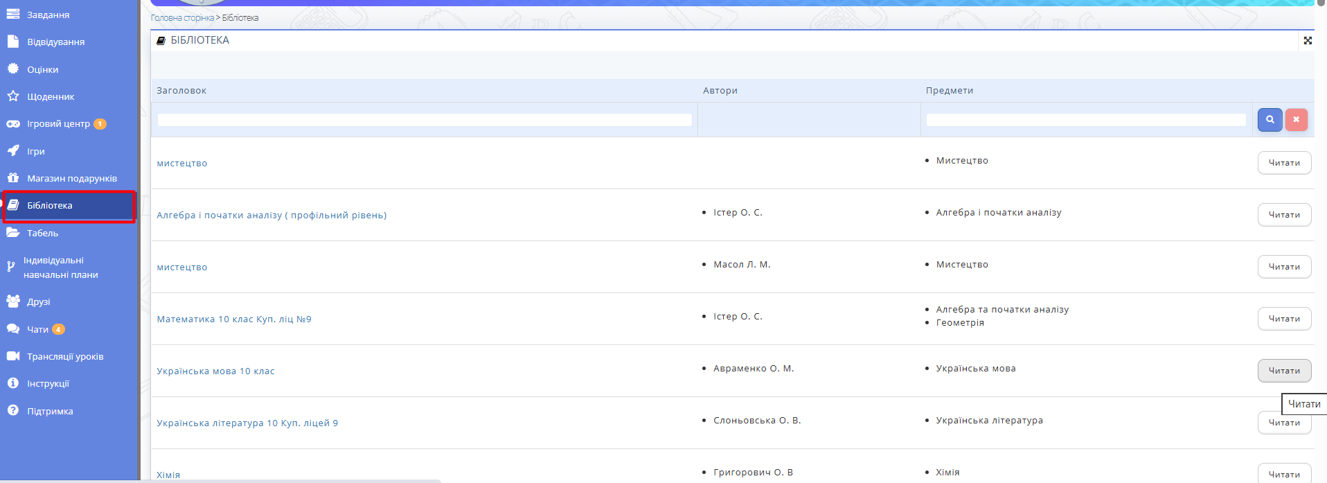 Бібліотека Бібліотека учня¶ Кроки¶ Перейдіть на сторінку "Бібліотека". Рис. 1 — Вигляд сторінки "Бібліотека" Оберіть потрібний підручник. Натисніть кнопку "Читати" для перегляду підручника в новому вікні браузера.