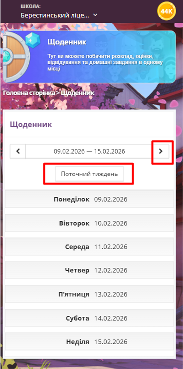 Дозволяє переглядати розклад і записи в щоденнику учня з тижня на тиждень.
