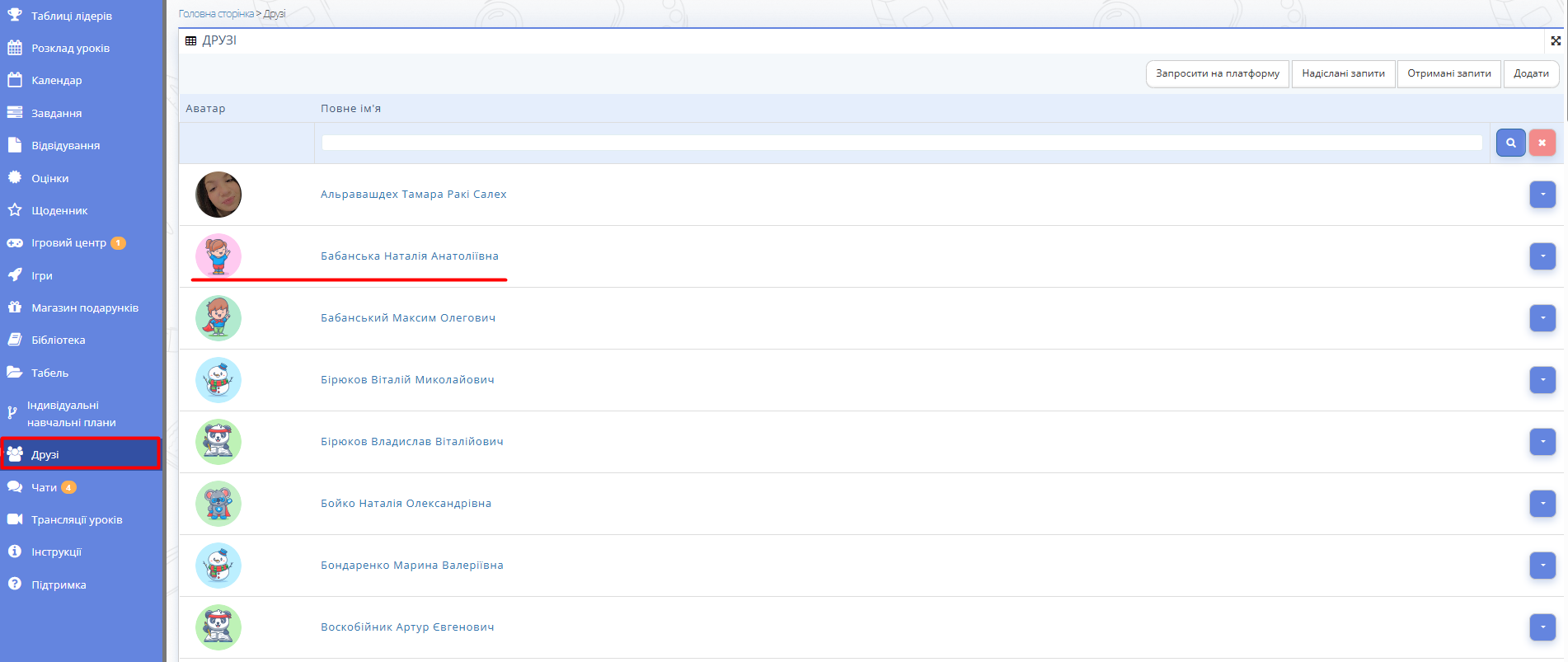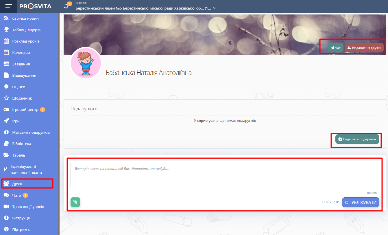 Щоб залишити публікацію у стрічці новин друзів, перейдіть у розділ "Друзі" та оберіть потрібного друга, натиснувши на його прізвище, ім'я та по батькові.
