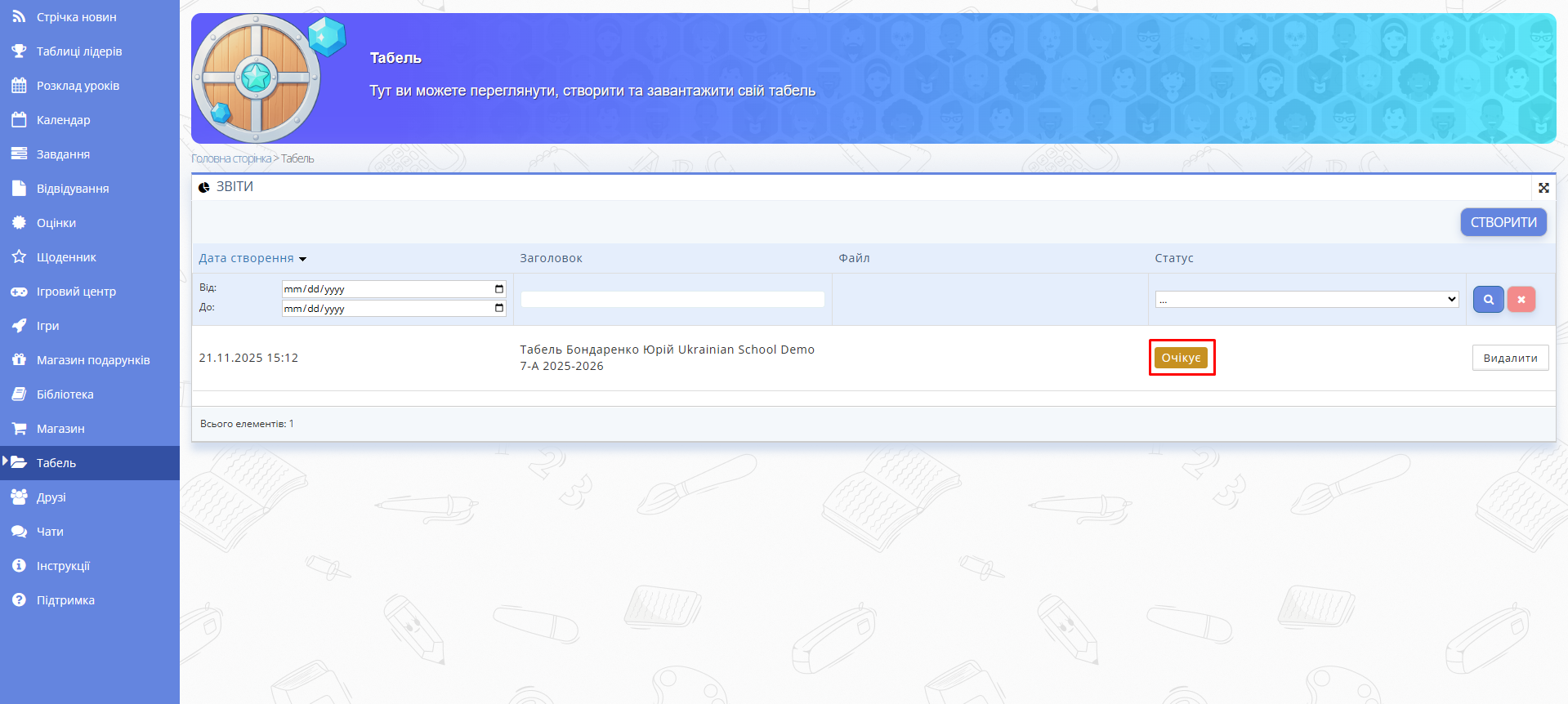 Після збереження у списку з’явиться запис із назвою табеля та статусом «Очікує» — це означає, що файл ще генерується.