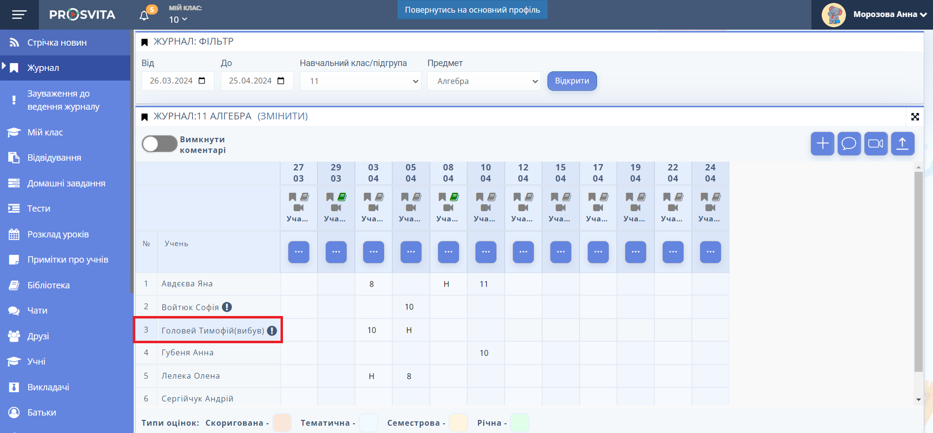 - Перевірте журнал — усі оцінки до дати відрахування зберігаються.