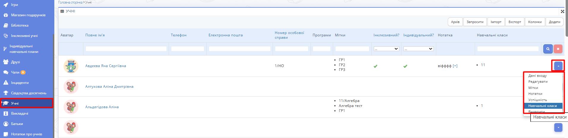 - Перейдіть у розділ Учні.