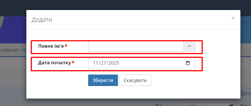 У вікні введіть прізвище учня, оберіть його зі списку, оберіть дату початку та натисніть Зберегти.