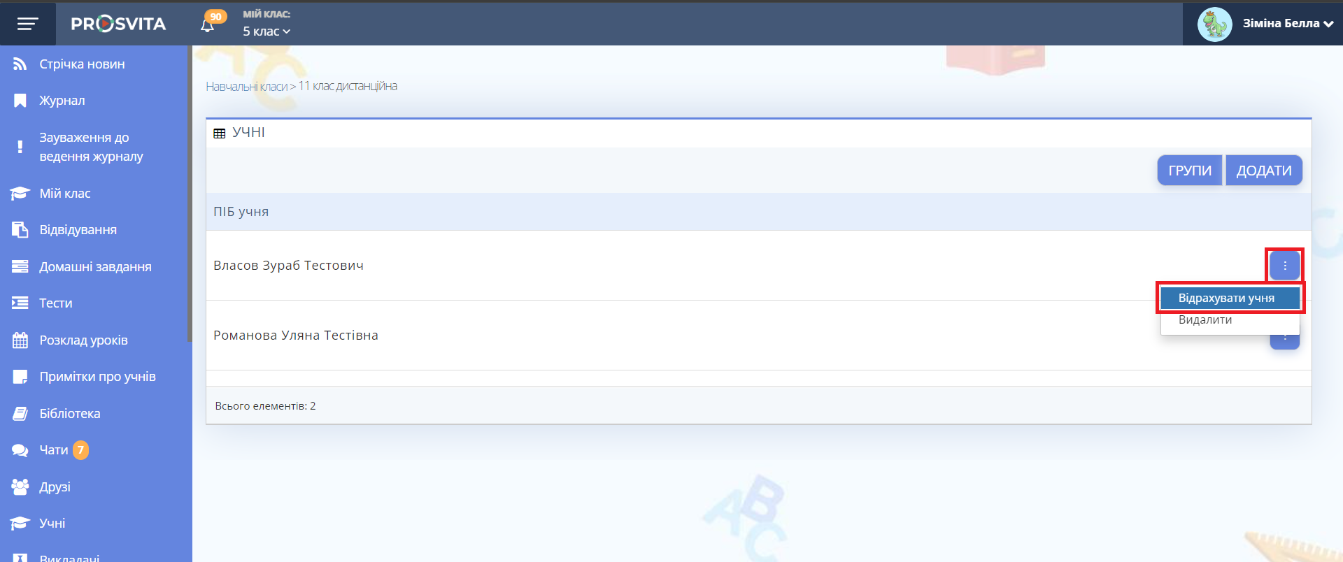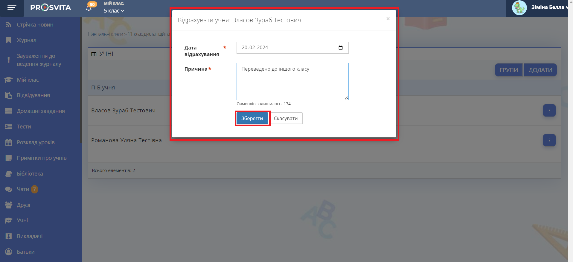 - Оберіть клас, з якого потрібно відрахувати учня.