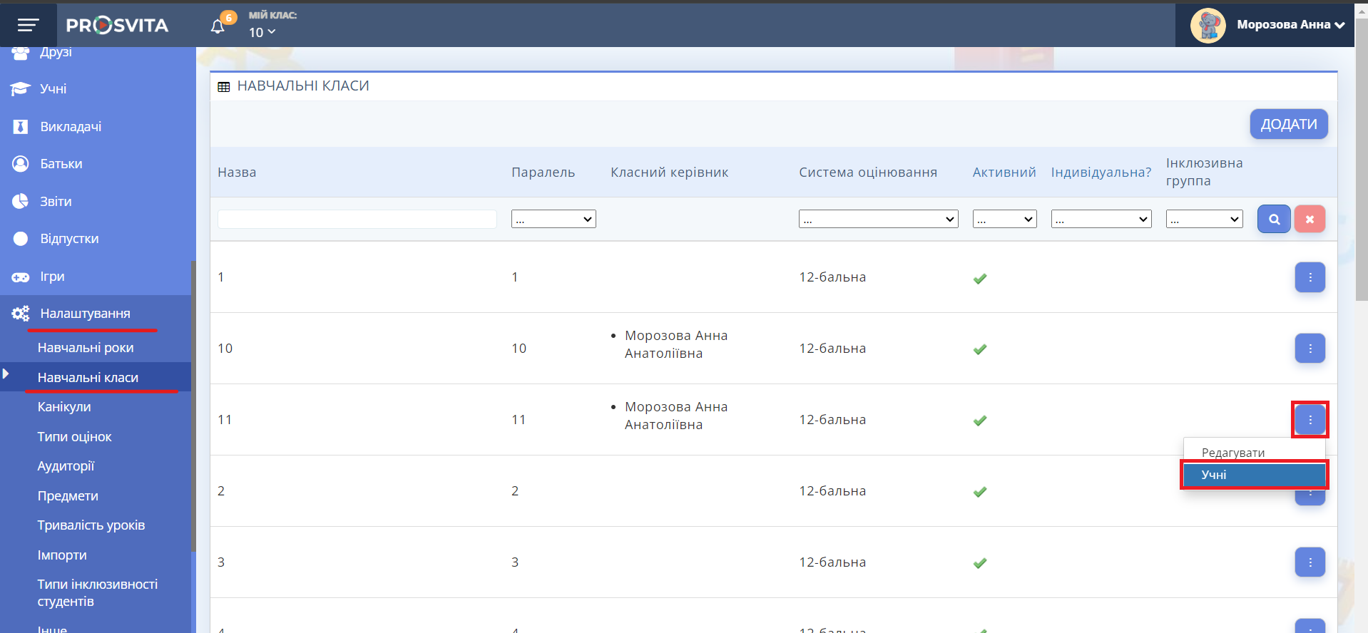 - Натисніть кнопку контекстного меню праворуч від класу та оберіть Учні.