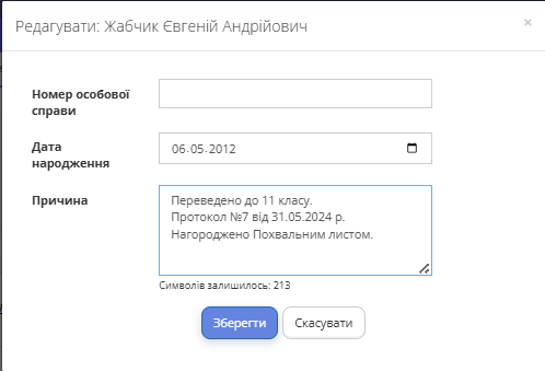 Наступним кроком відкриється відповідне вікно для заповнення причини переведення (Рис. 2). Заповнивши його необхідною інформацією, Вчитель повинен натиснути на кнопку "Зберегти", після чого всі записи відображатимуться на сторінці (Рис. 3).